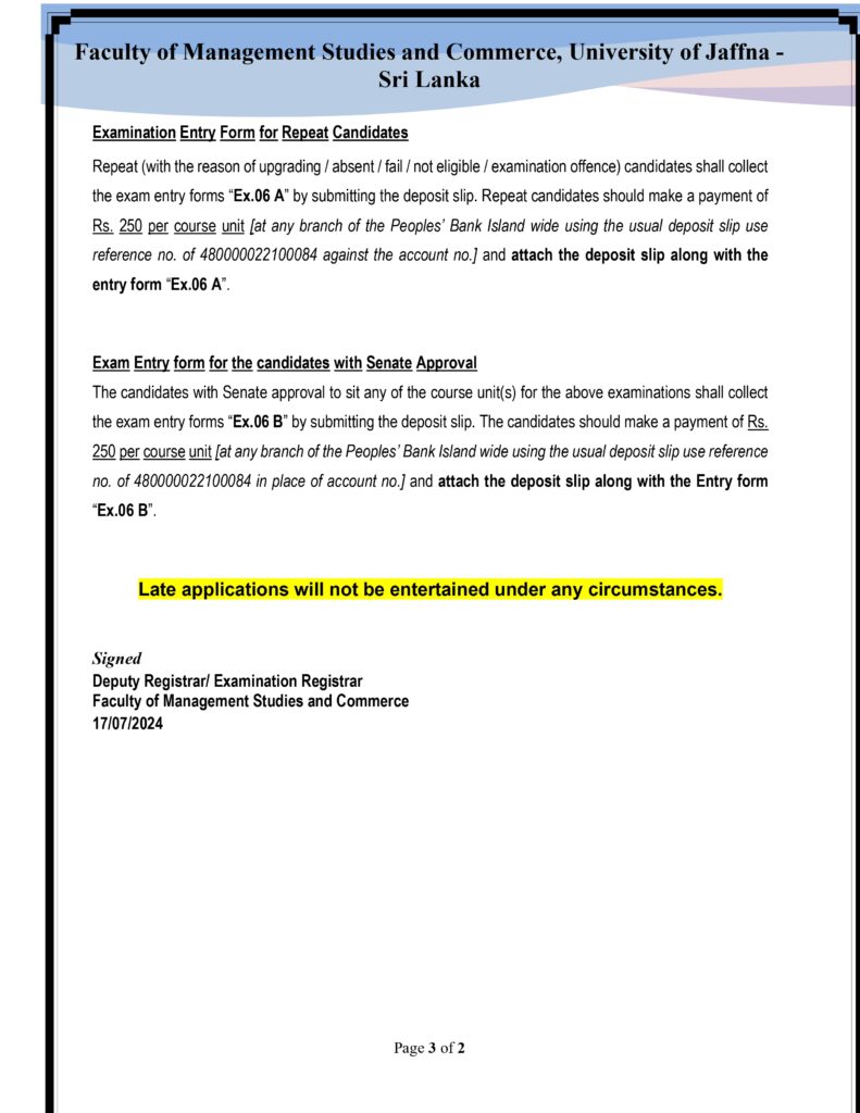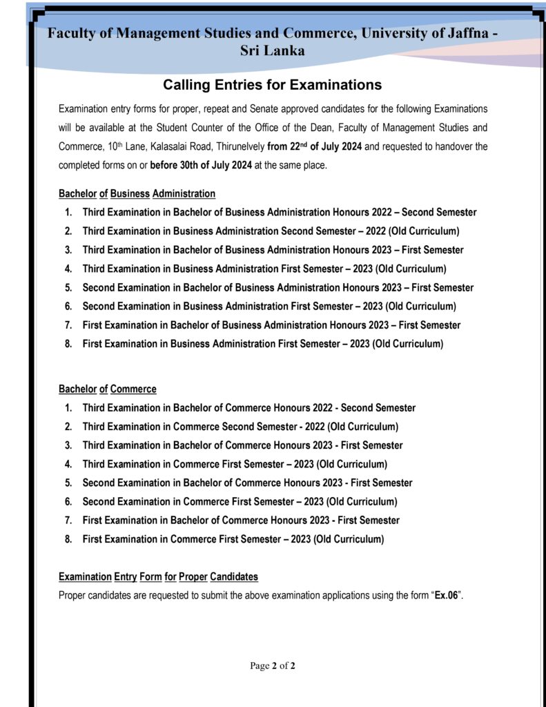 17Jul2024Calling Entries for Examinations – Bachelor of Business Administration and Bachelor of CommerceByEditor FMSC-UoJNotices, Students0 Click here to fill the Google Form – Fourth Examination in Business Administration Second Semester – 2022 Click here to fill the Google Form – Fourth Examination in Commerce Second Semester – 2022